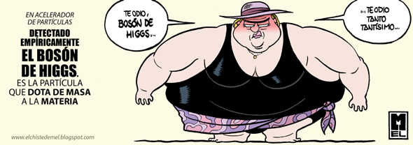 Y ya para animarnos de nuevo, la sección de humor de esta semana, en la que me centro en el tema candente del momento: el descubrimiento del bosón de Higgs. La red se ha llenado inmediatamente de parodias cómicas con que amenizar el hallazgo: en Abstruse Goose, Sheldon Cooper, el chiste de Mel, Amazings (jugando con el doble significado de mass en inglés, que es masa y misa) y de nuevo Amazings homenajeando a Tarantino y la portada de la Razón (vía ciencia en el s. XXI).